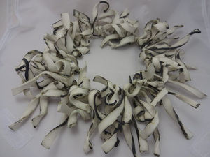 2020Collier van porselein met kobalt oxide. Inspiratie voor dit collier zijn de pentekeningen van Rembrand van Rijn. Zoals Rembrand zijn strepen in de pentekening zet zo lopen ook de strepen over dit collier kris kras door elkaar maar toch geordend.