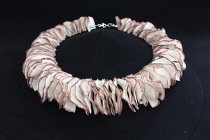 2020Collier gemaakt van porselein, geinspireerd door de onderkant van een padestoel de lamellen waar de sporen zitten. Afgewerkt met een ijzeroxide.