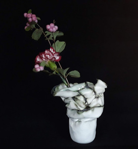 2021Vaas van porselein, verkreukeld en met groene oxides